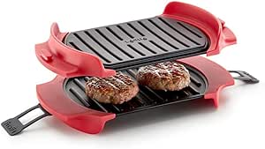 The Lekue Microwave Grill offers a fast and convenient solution for grilling meat, chicken, fish, sandwiches, paninis, quesadillas, and vegetables in just a few minutes. Made of microwave-approved material, it efficiently transforms microwave energy into heat, providing perfect grilling results. Preheating the grill and securing food with included silicone bands ensures even cooking. Its non-stick surface simplifies cleanup and reduces the need for oil or butter. The grill is dishwasher safe for added convenience, though it’s recommended to use nylon or silicone tools to protect the cooking surface. For safe and quick grilled meals, detailed cooking times are included.