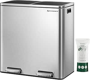 The SONGMICS Trash Can brings elegance and functionality to your kitchen. Its sleek silver and black design complements any decor, while the step pedal allows for hands-free operation, making waste disposal convenient and hygienic. Crafted from durable stainless steel, it promises longevity, and the soft-close lid ensures a quiet environment. Featuring two removable inner buckets, cleaning up spills is a breeze. Measuring 23.2”L x 14.4”W x 25.6”H, it includes 15 trash bags, offering ample capacity with its 2 x 10.6-gallon compartments. This trash can seamlessly combines style, practicality, and ease of use.
